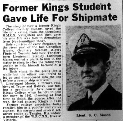 Lieutenant Mason died when his ship, HMCS Valleyfield was torpedoed and sunk on May 7, 1944, by U-